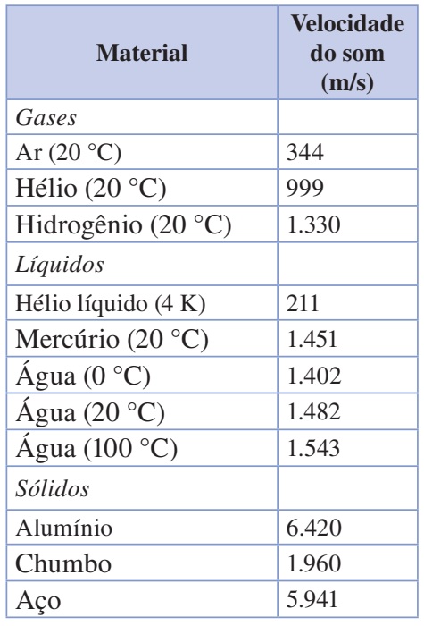 =\left[ \frac{kg.m.s^{-2}.m^{-2}}{kg.m^{-3}} \right]^{1/2}=\left[ \frac{m^{2}}{s^{2}} \right]^{1/2}=\frac{m}{s}Tabela com algumas velocidades do som nos materiais